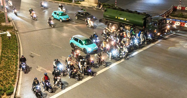 Tại tuyến Láng – Trường Chinh, lúc 0h, dòng xe máy thưa dần nhưng vẫn chấp hành nghiêm hiệu lệnh đèn tín hiệu.