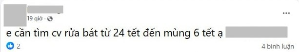 Nhưng không chỉ dừng ở dọn dẹp, nhu cầu trong Tết cũng đang tăng lên thấy rõ. Đó là những kèo rửa bát, nấu ăn, quét dọn cơ bản mỗi ngày – phục vụ đúng “mùa cỗ bàn”. Một bài đăng tìm người rửa bát trong nhóm giúp việc khiến nhiều người chú ý khi ghi rõ thời gian: T ừ 24 Tết đến mùng 6 Tết . Chỉ một dòng ngắn gọn nhưng đủ gợi ra bức tranh quen thuộc: Tết càng gần, họ hàng càng đông, bếp càng “chạy hết công suất” và đống bát đĩa càng… không có điểm dừng.