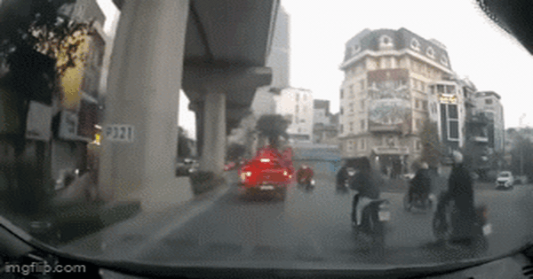 Lúc này, người điều khiển xe máy đã phóng vượt lên từ bên phải tạt qua đầu một xe máy khác gây va chạm. Người này ngã lăn ra đường ngay khi một ôtô bán tải đi tới và cán qua.