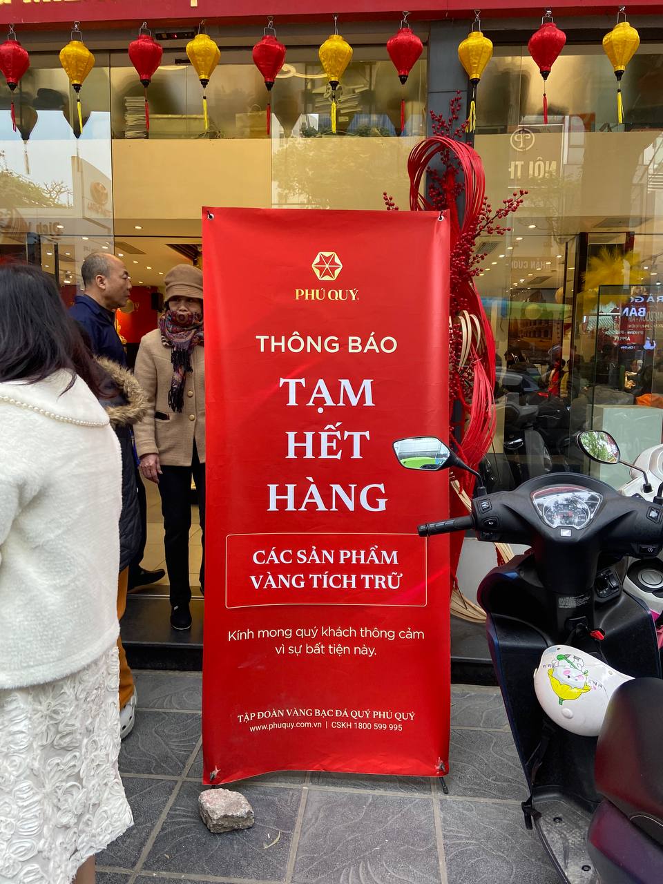 Theo ghi nhận của chúng tôi vào lúc 10h30 sáng 2/2, Cửa hàng Phú Quý cơ sở 132 Cầu Giấy (Hà Nội) đã trưng biển thông báo hết hàng các sản phẩm bạc miếng – bạc thỏi, và các sản phẩm vàng tích trữ. Nhiều người đến mua bạc, mua vàng phải “về tay không”, có phần tiếc rẻ vì “biết vậy đi từ sớm”.