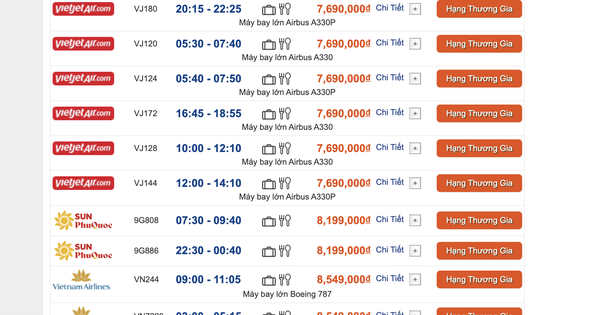 Nếu như cách đây 1 tháng, nhiều người còn có cơ hội chọn đi Vietnam Airlines với “giá kịch trần” ở nhiều khung giờ thì hiện nay, gần như toàn bộ các chuyến bay giờ đẹp trưa và chiều đã hết sạch vé phổ thông, chỉ còn vé phổ thông linh hoạt giá gần 5,5 triệu đồng/chiều và hạng thương giá gần 10 triệu đồng/chiều. Các hãng Bamboo Airways, Vietjet hay Sun PhuQuoc Airways cũng “dàn hàng” vé thương gia từ 8 – 9 triệu đồng/chiều.